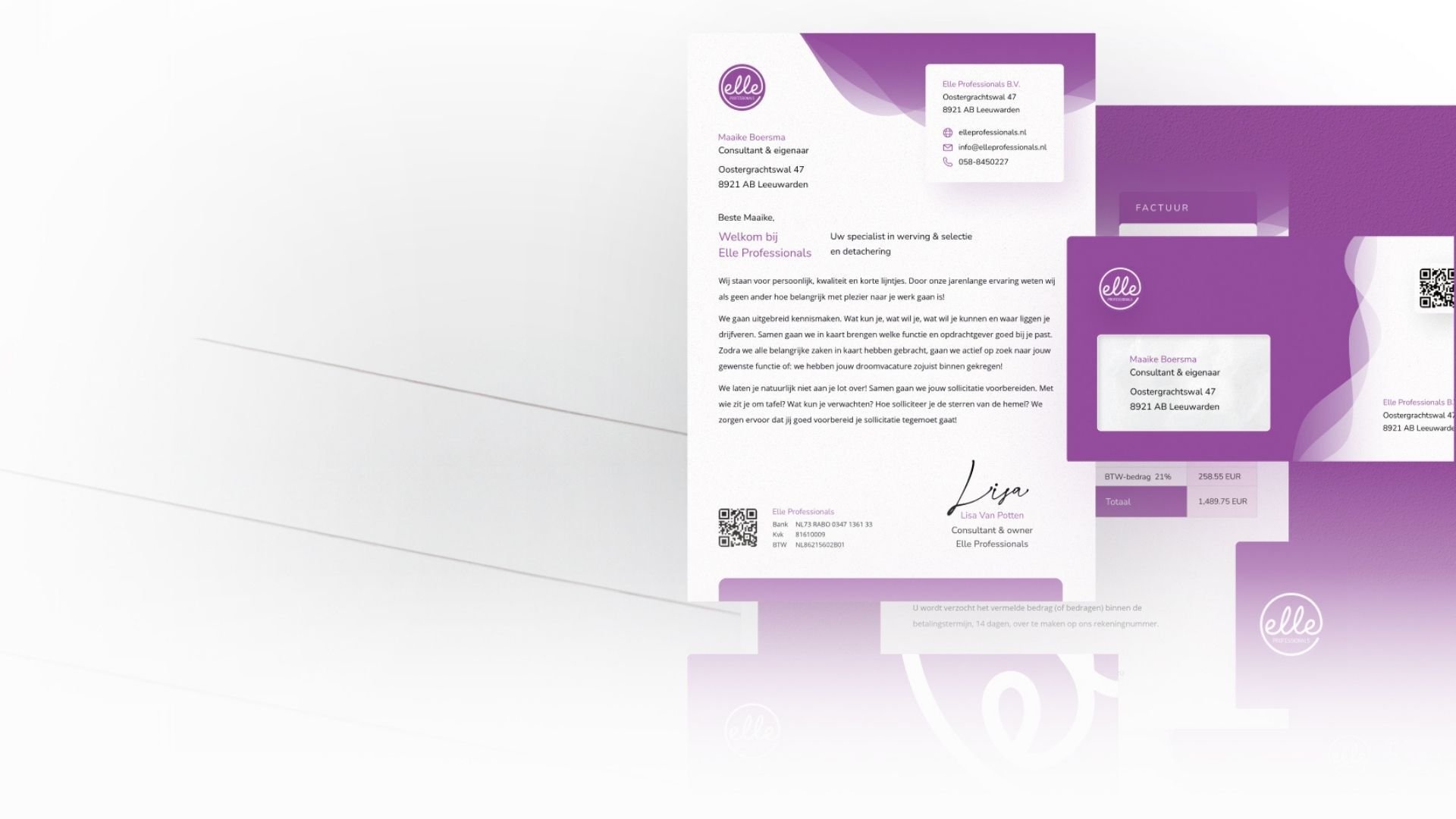 Je ontvangt een compleet huisstijlhandboek met logo’s in alle formaten, kleurcodes, typografie, stijlelementen.